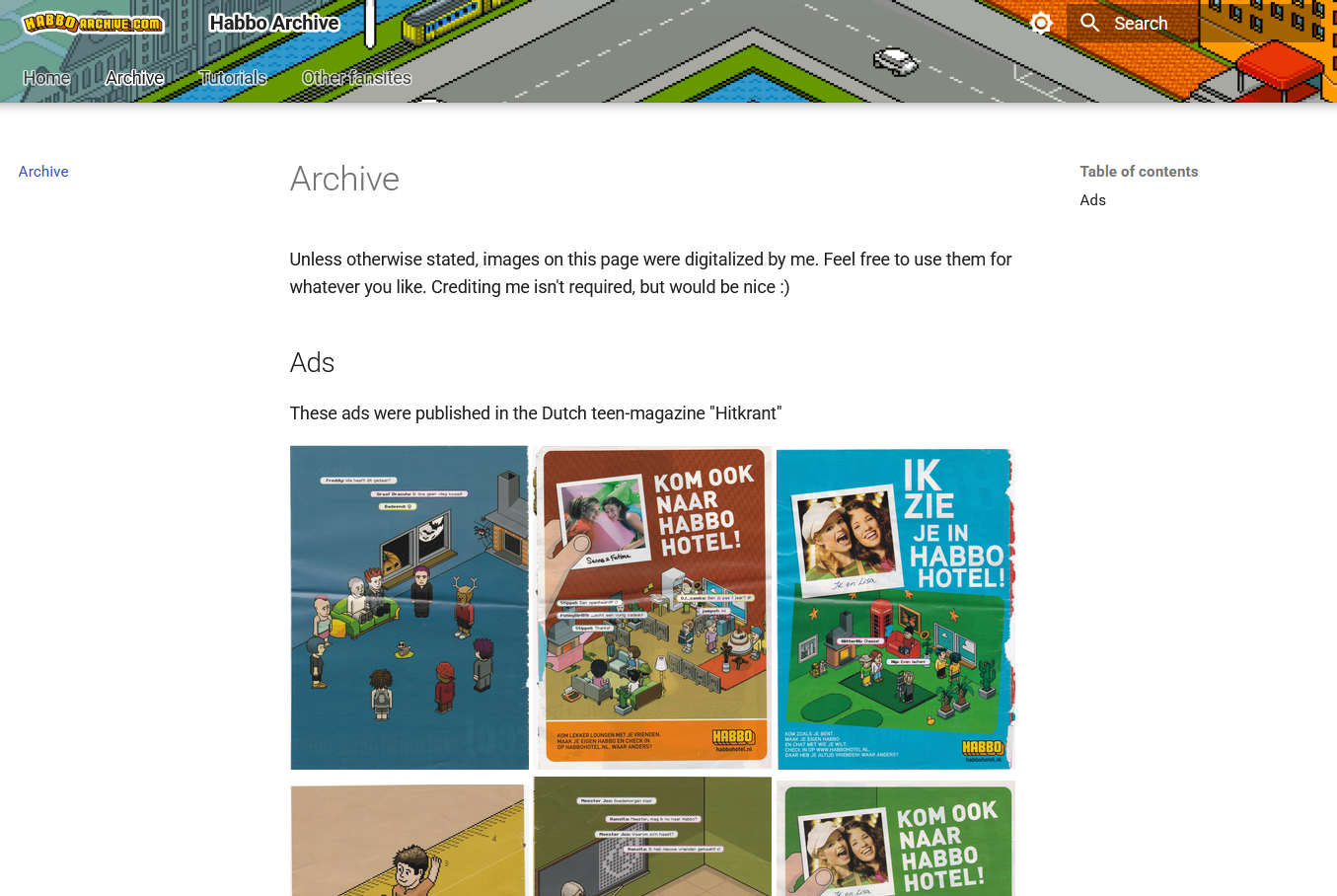 The Habbo Archive is a fansite which functions as a public archive of Habbo Hotel memorabilia I've personally collected and digitalized, like posters and ads.
